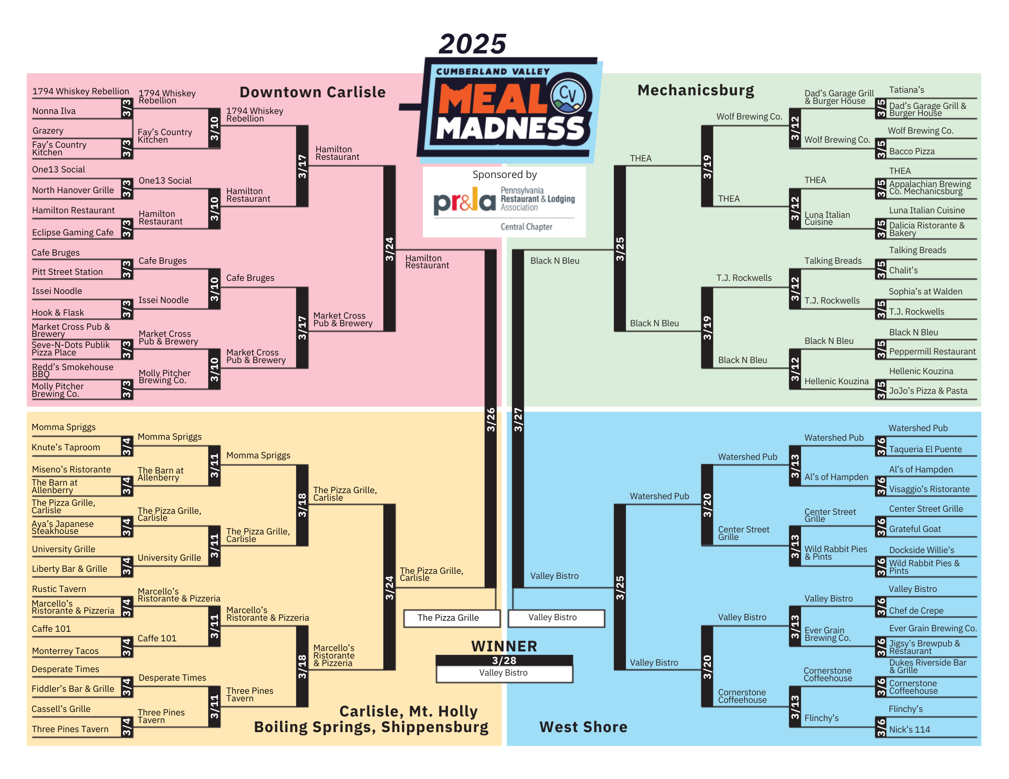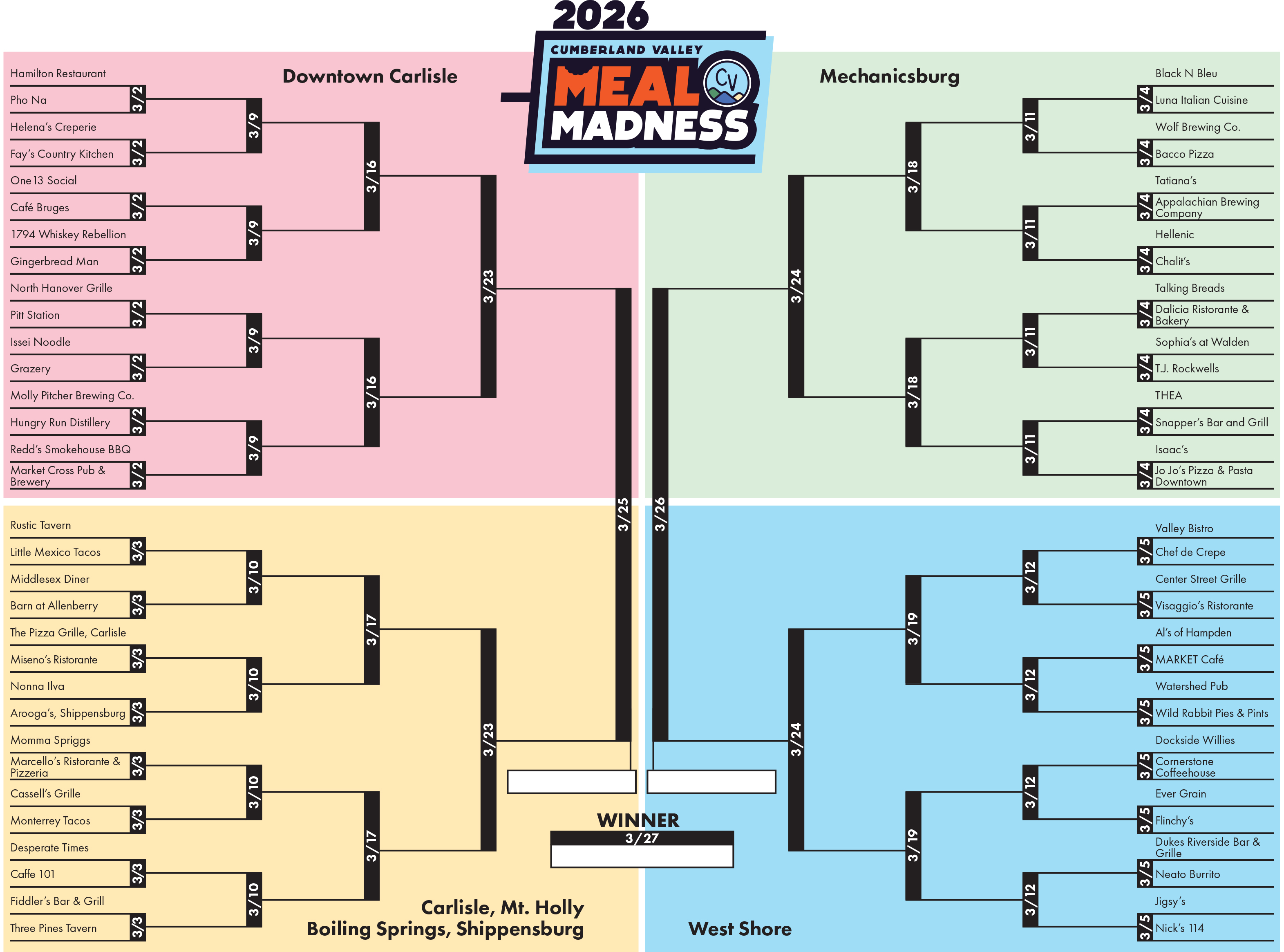Beginning on March 2, 2026, you can vote for your favorite restaurant in 32 matchups on our Cumberland Valley Instagram page (@cumberlandvalleypa). The winner of the vote advances in the tournament and through their region (Downtown Carlisle, Mechanicsburg, Carlisle/Mt. Holly/Boiling Springs/Shippensburg, and the West Shore). The contest ends on March 27, 2026.